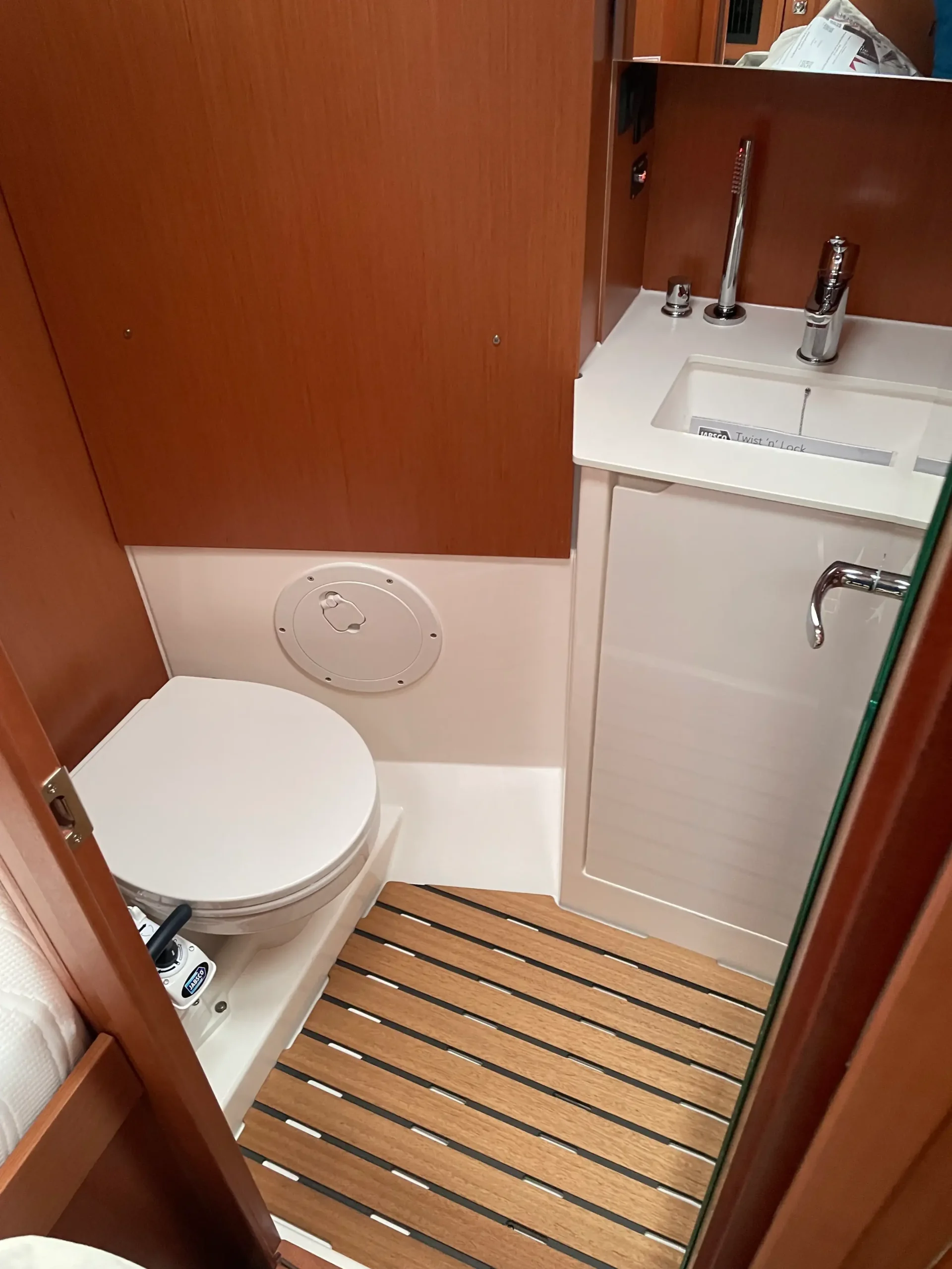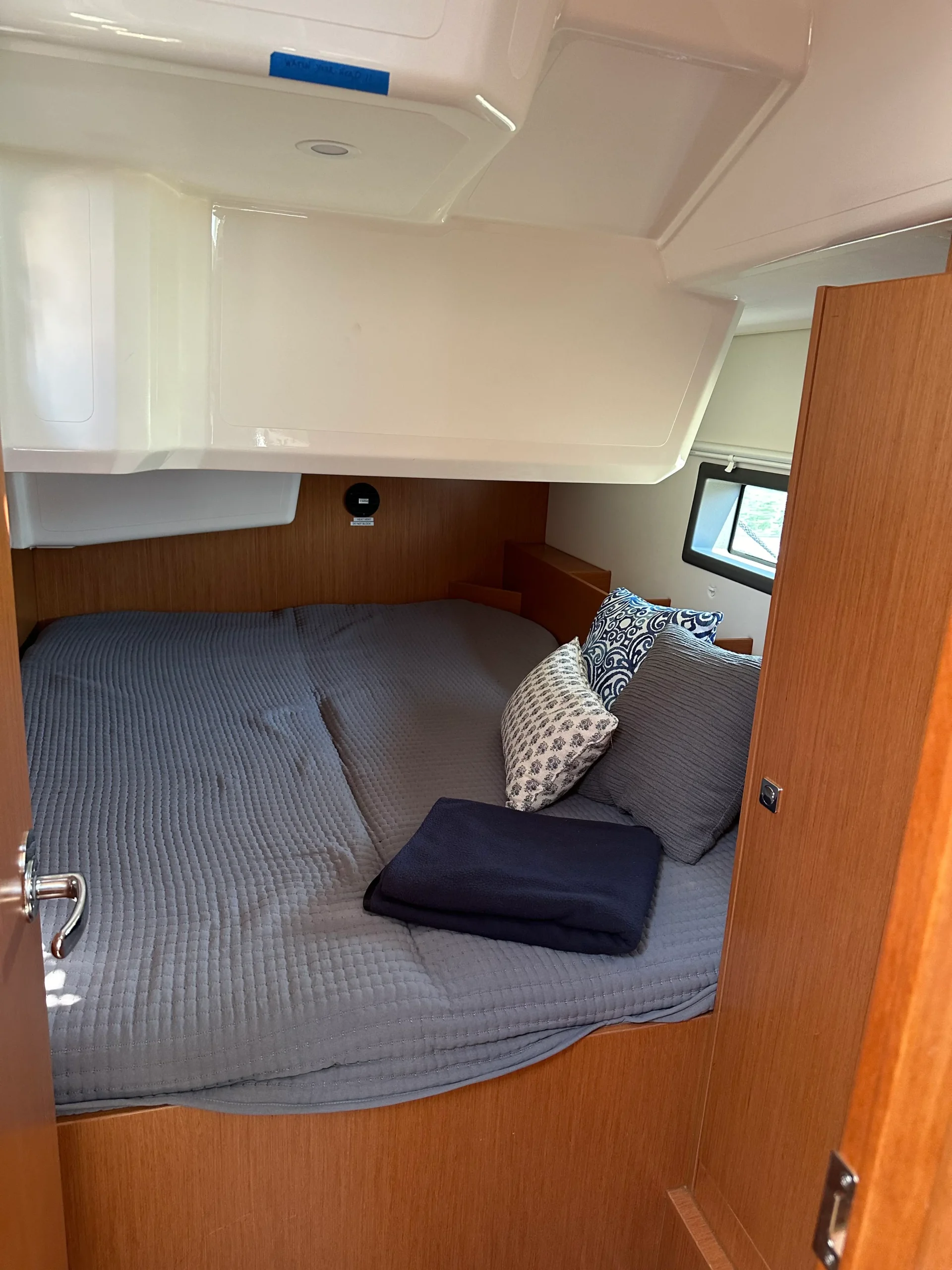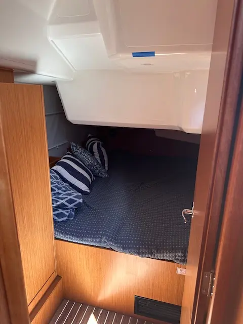 Chines increase stability while heeling at an angle of 15 to 20 degrees and allow for more volume in the rear and stern of the hull. The dynamic effect of the chines creates faster water drainage from the hull. What’s more, the innovative V-Bow pushes a larger volume of water flow that keeps the bow from being pushed deeper into the water under heavier winds and increasing heel due to the larger boat volume in the stern. The result is easy steering under all weather conditions. On deck is a self-tacking jib and main sail that offer 922 square feet of sail area and in-mast furling. Control lines and sheets lead to central companionway winches and can be operated from the spacious and extended cockpit. The fold-up teak table and enlarged cockpit area make for a great place to relax and socialize after a long day sailing.