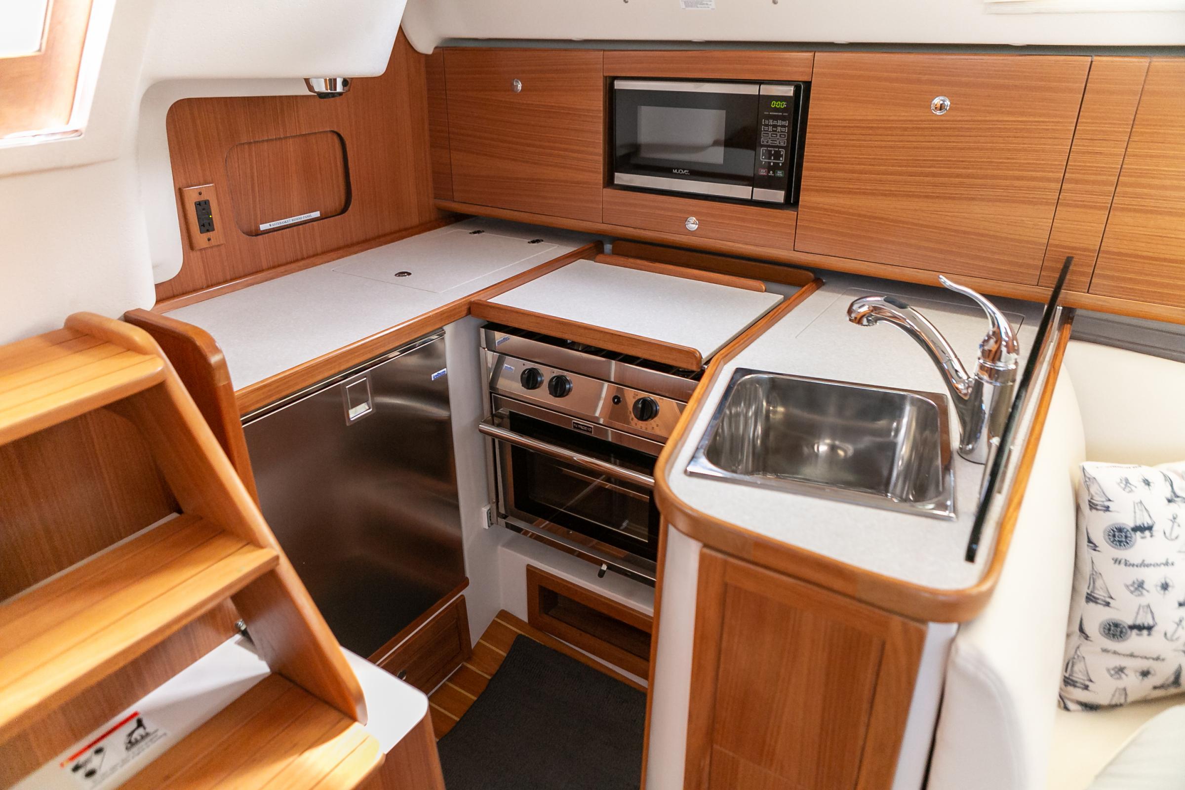 Brand new 2022 Catalina 315. Equipped with a 150% furling Genoa, in mast furler, full Bimini with dodger connector, extra refrigerator and freezer, leather interior, dinette table converts to full double birth, full electronics with plotter and auto pilot, folding leather wrapped helm wheel, microwave and more! Deep fin lead keel Amazing room down below with nice inner spring mattress. Over 6′ 2″ head room Leather interior Drop down Salon table with cushions. Sleeps (6) with innerspring mattress.