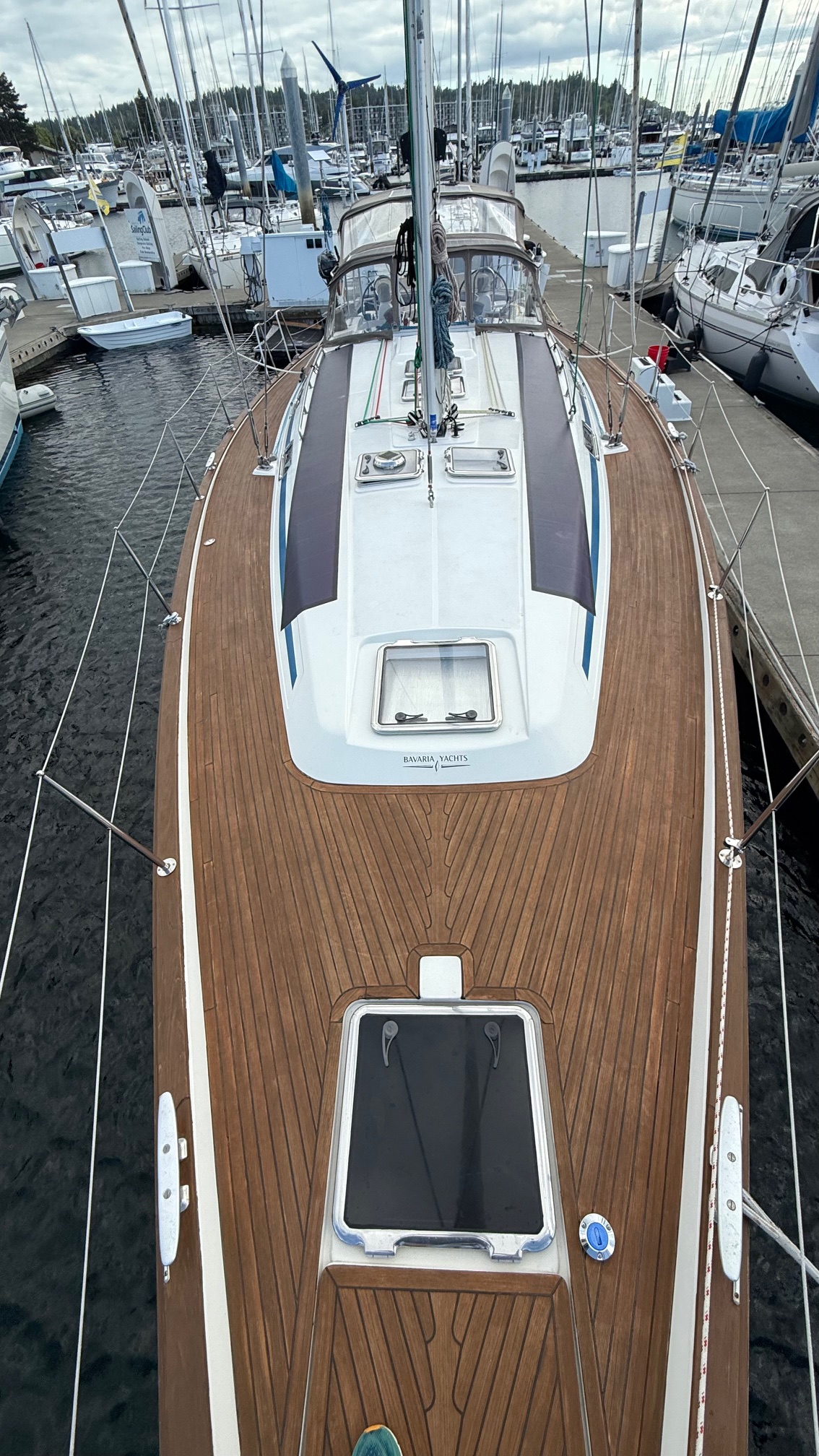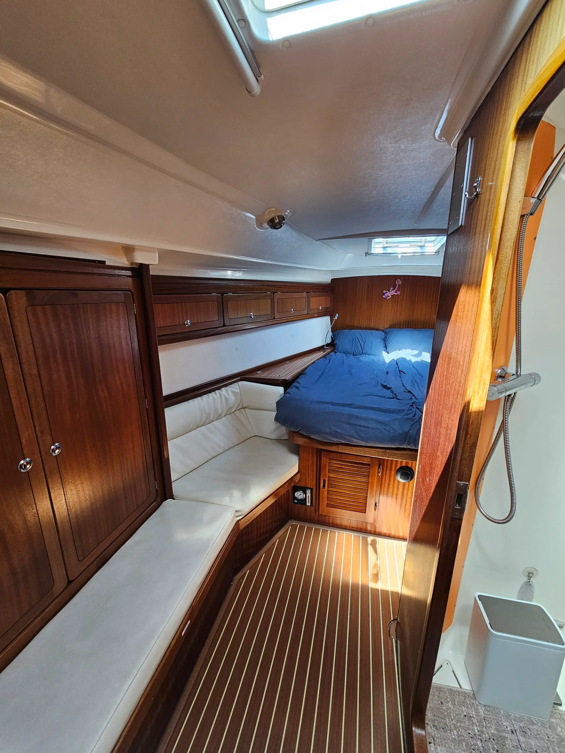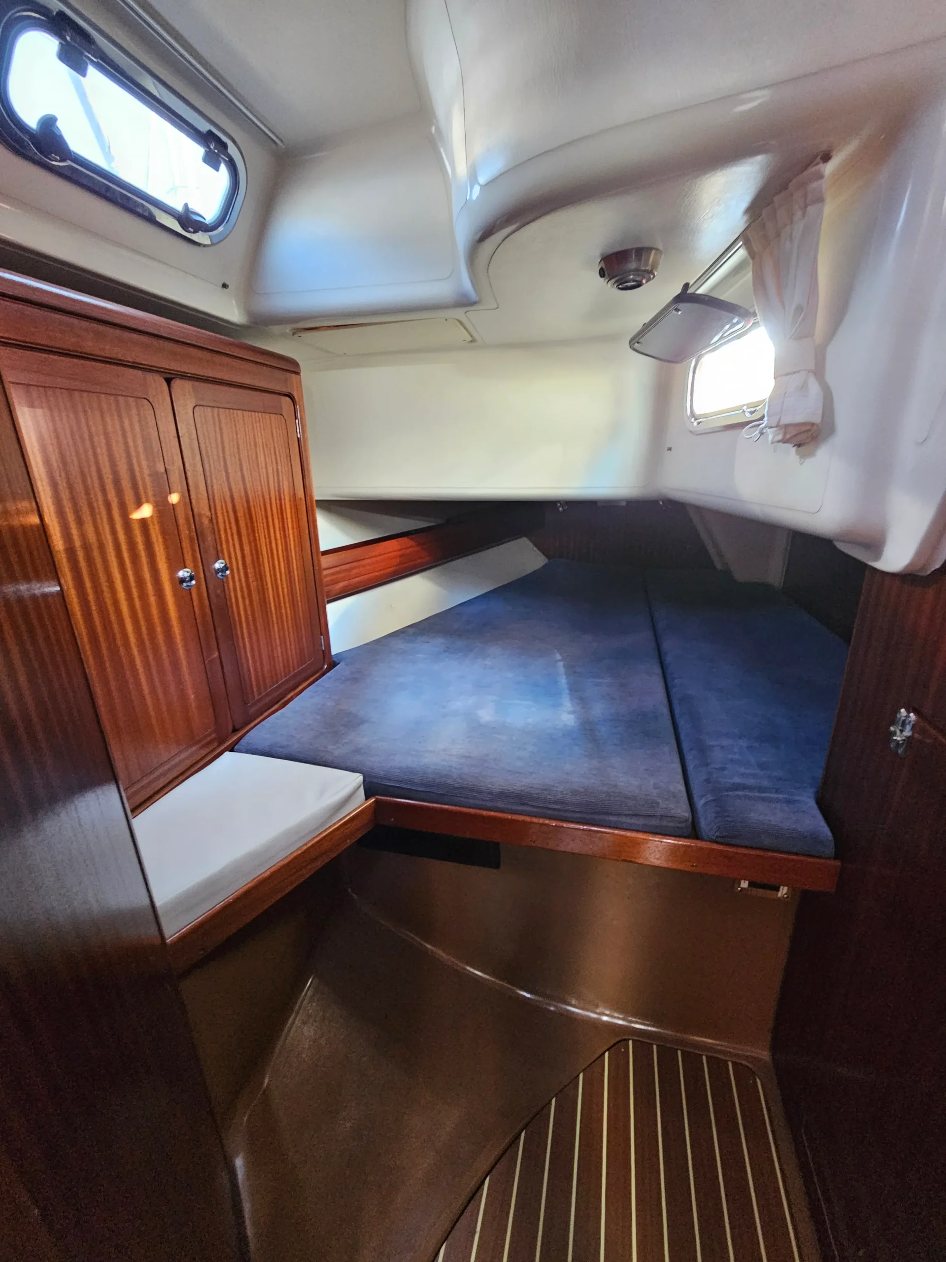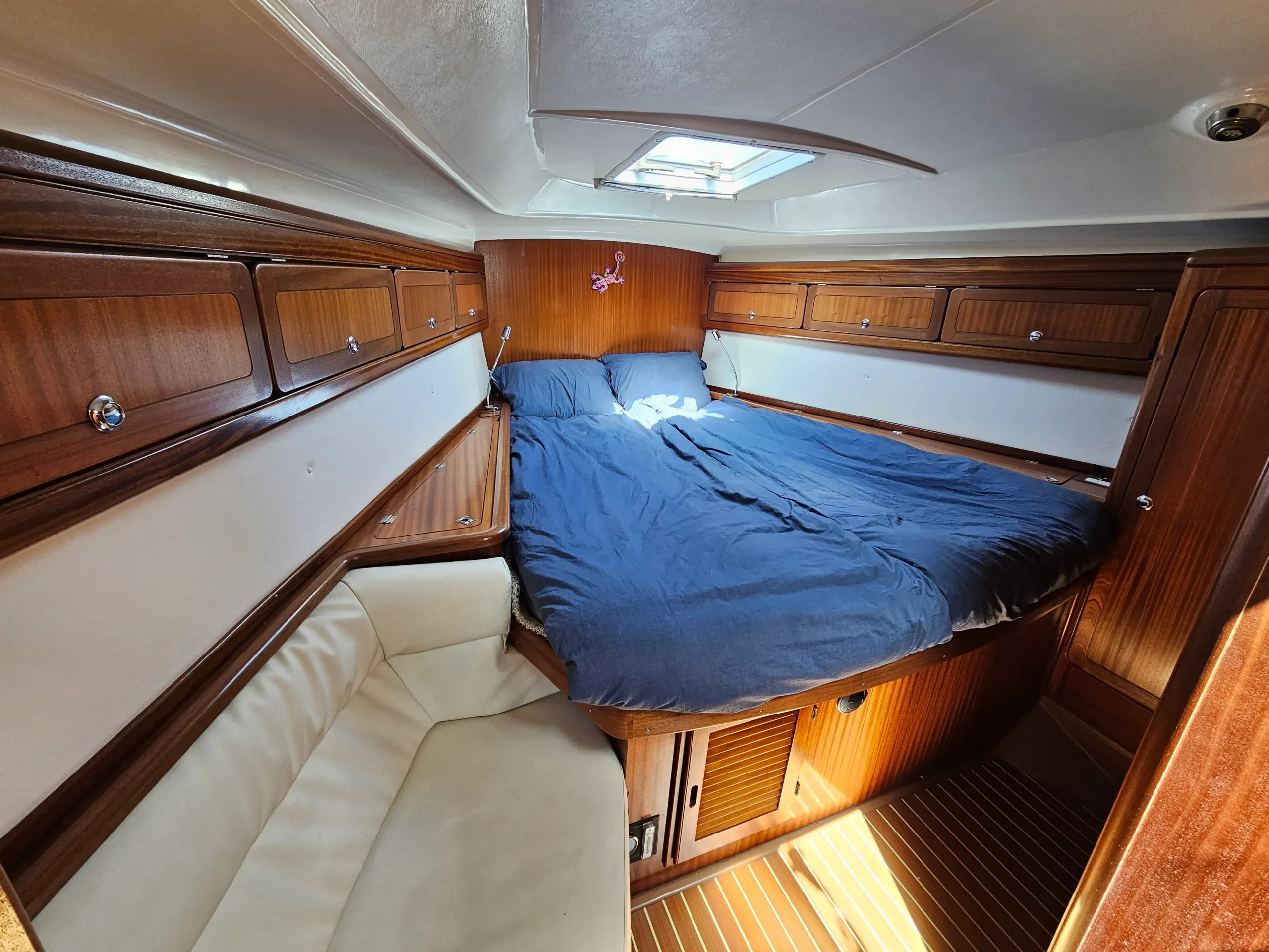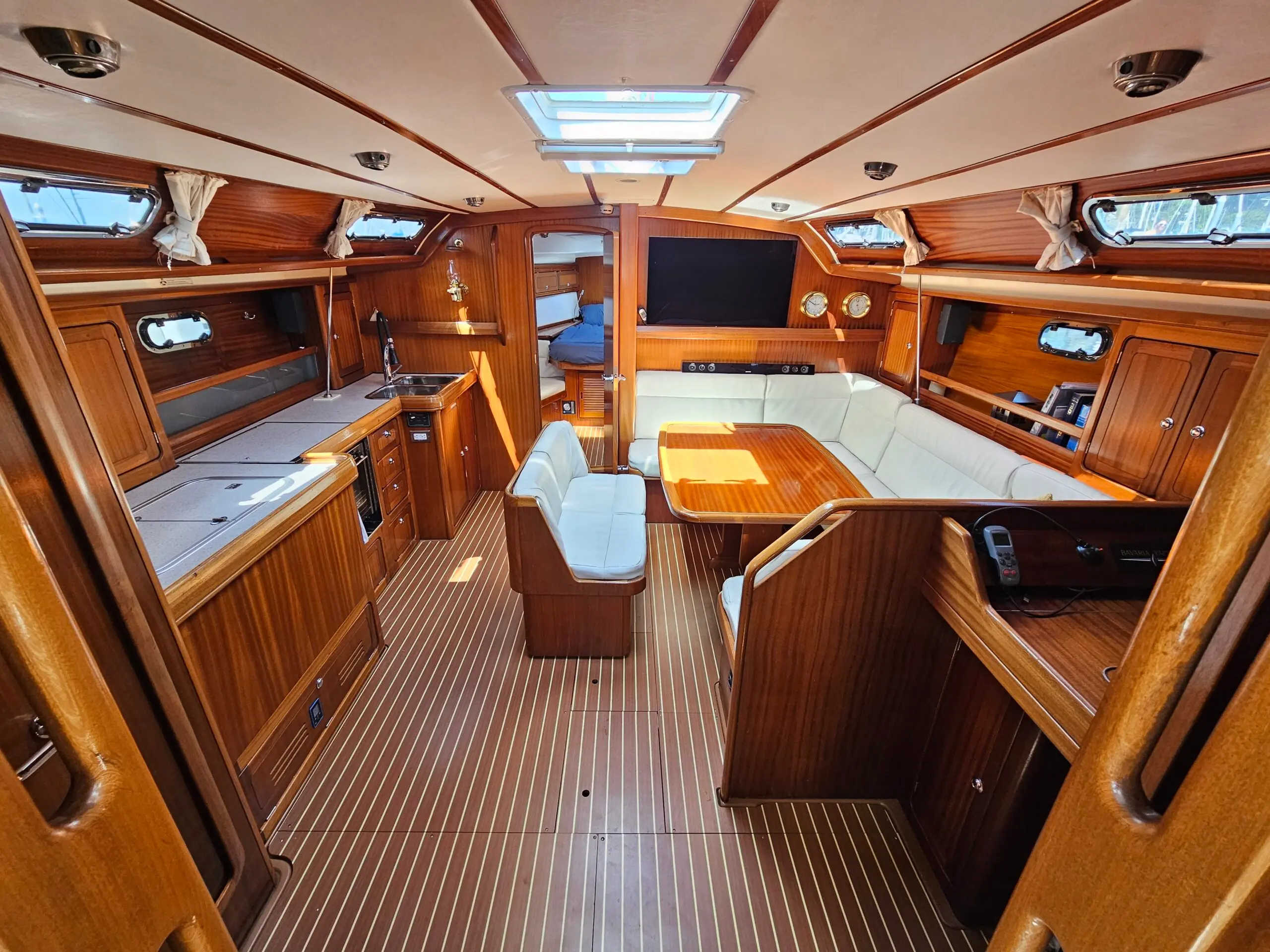 Inspirare has a 3-cabin owner’s layout with a large forward “owner” stateroom and head and 2 cabins aft, each with a double bed and storage. She is in Immaculate shape for her age. Most people who see her for the first time think she’s brand new, including the fully covered teak decking and cockpit. Make sure to check out the brand new custom-made cockpit wooden table with compass rose intarsia. Gorgeous! Spacious and comfortable! The wide beam combined with the 48ft overall length, makes it very comfortable to live in. The forward cabin head is massive with a hot shower that is actually useable!