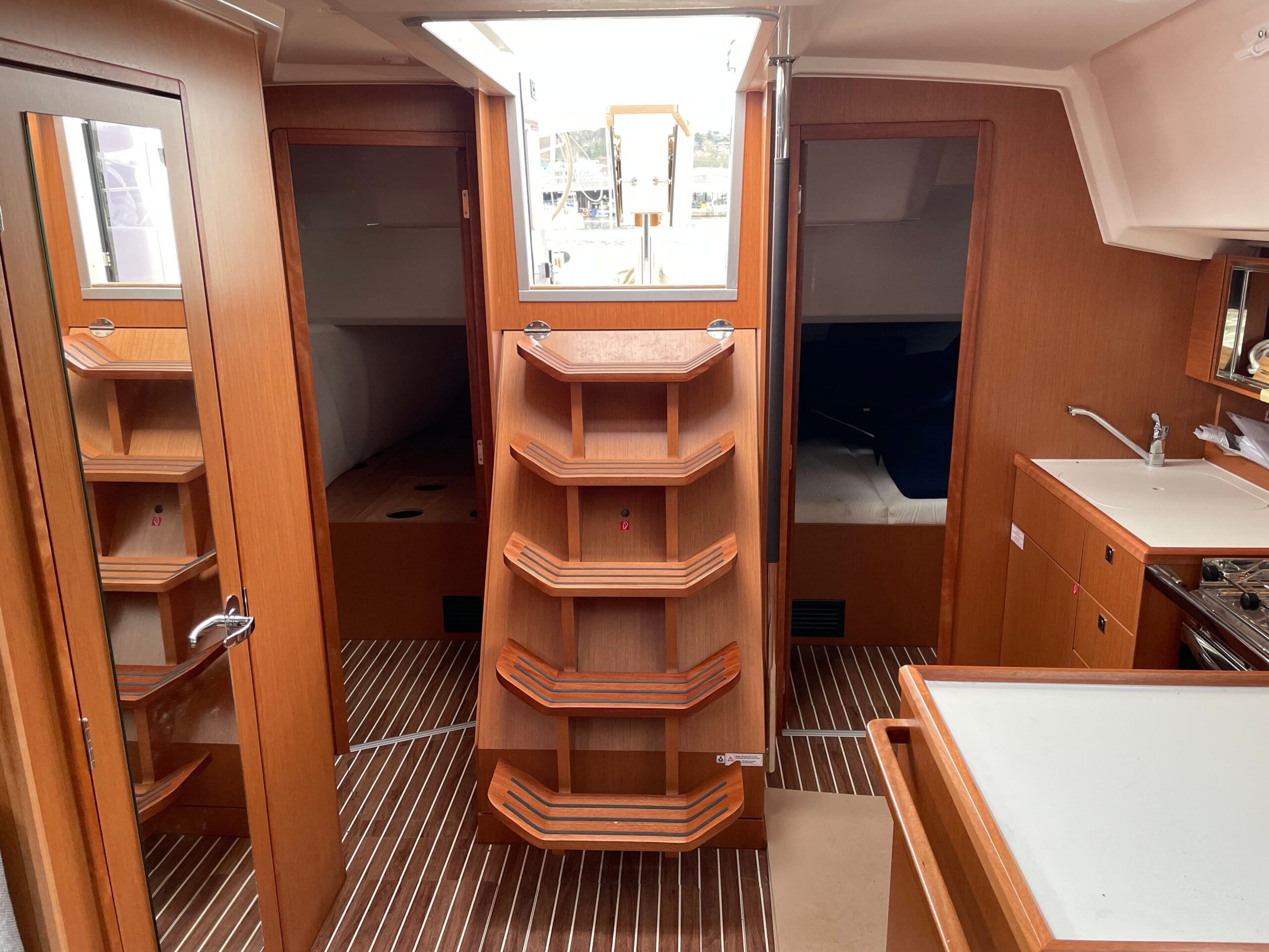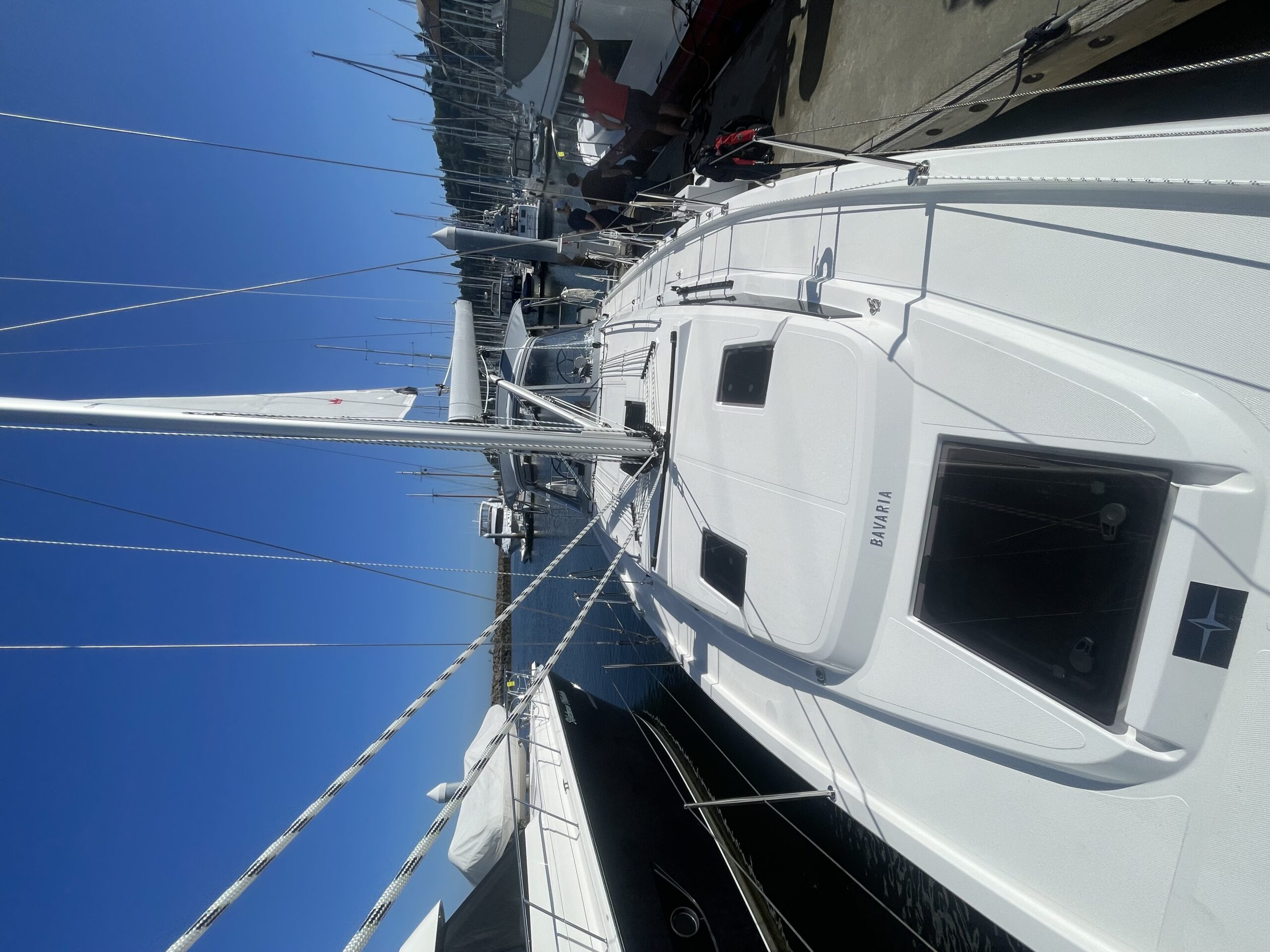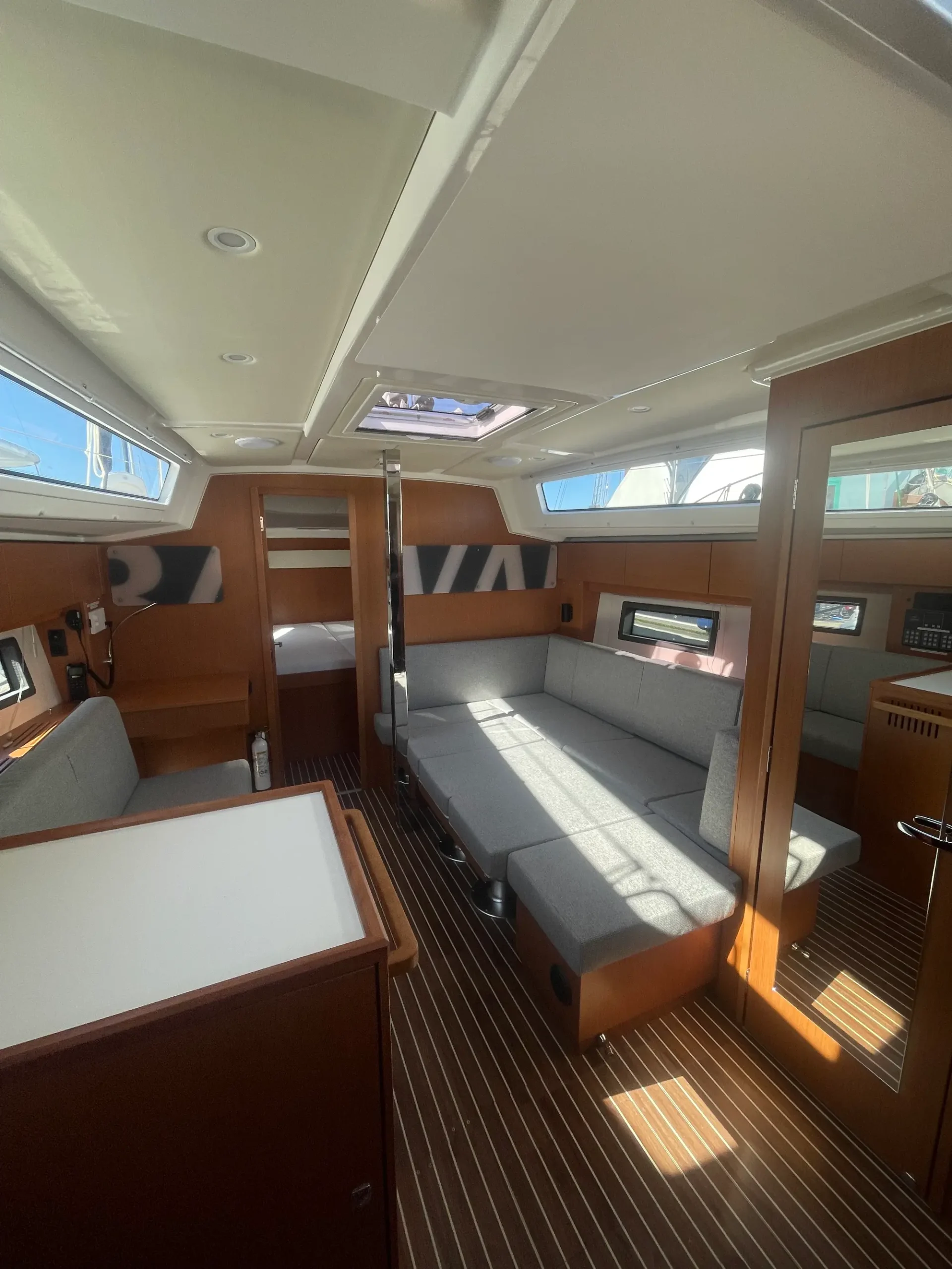 The Bavaria C38 combines perfect sailing characteristics, easy handling and maximum use of the interior space. Distinctive design features, such as the Bavaria V-bow and Chines at the stern, guarantee safe and fast sailing characteristics and an incredible amount of space below deck. The foredeck and side decks provide generous room for a sailing yacht of this size. The innovative hull design also opens up new dimensions below deck. The U-shaped seating area at the starboard side and the portside lounge bench easily cater for eight people during a cozy dinner.